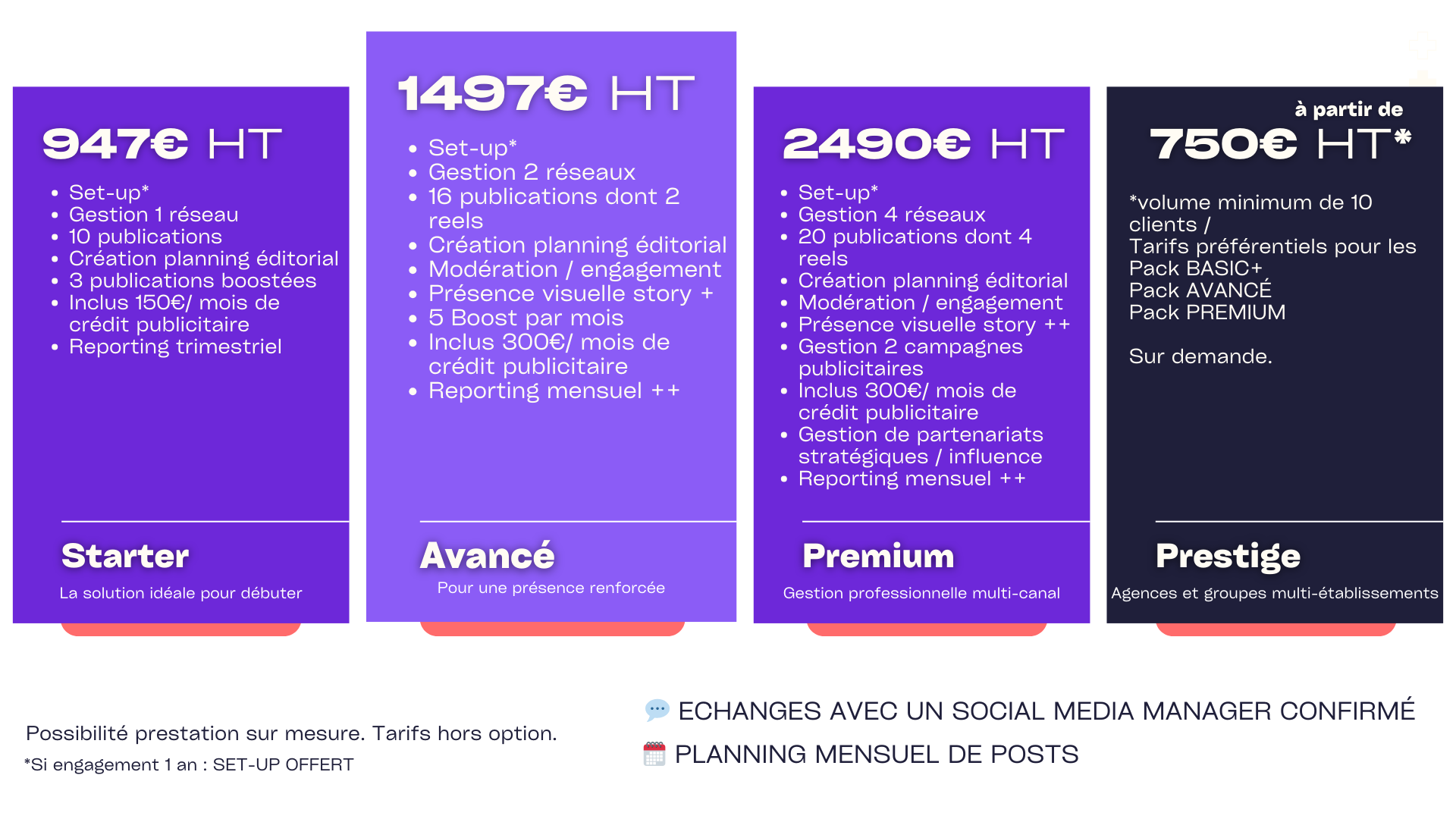 Nous proposons des formules adaptées à vos besoins incluant audit ou création de compte, création de contenu (photos, vidéos, visuels infographiques), calendrier éditorial, animation, suivi statistique, campagne de publicité et marketing d’influence. Nous ne fonctionnons pas sous forme de pack mais un vrai accompagnement stratégique avec une formule sur mesure adaptée à votre besoin et votre budget de communication.