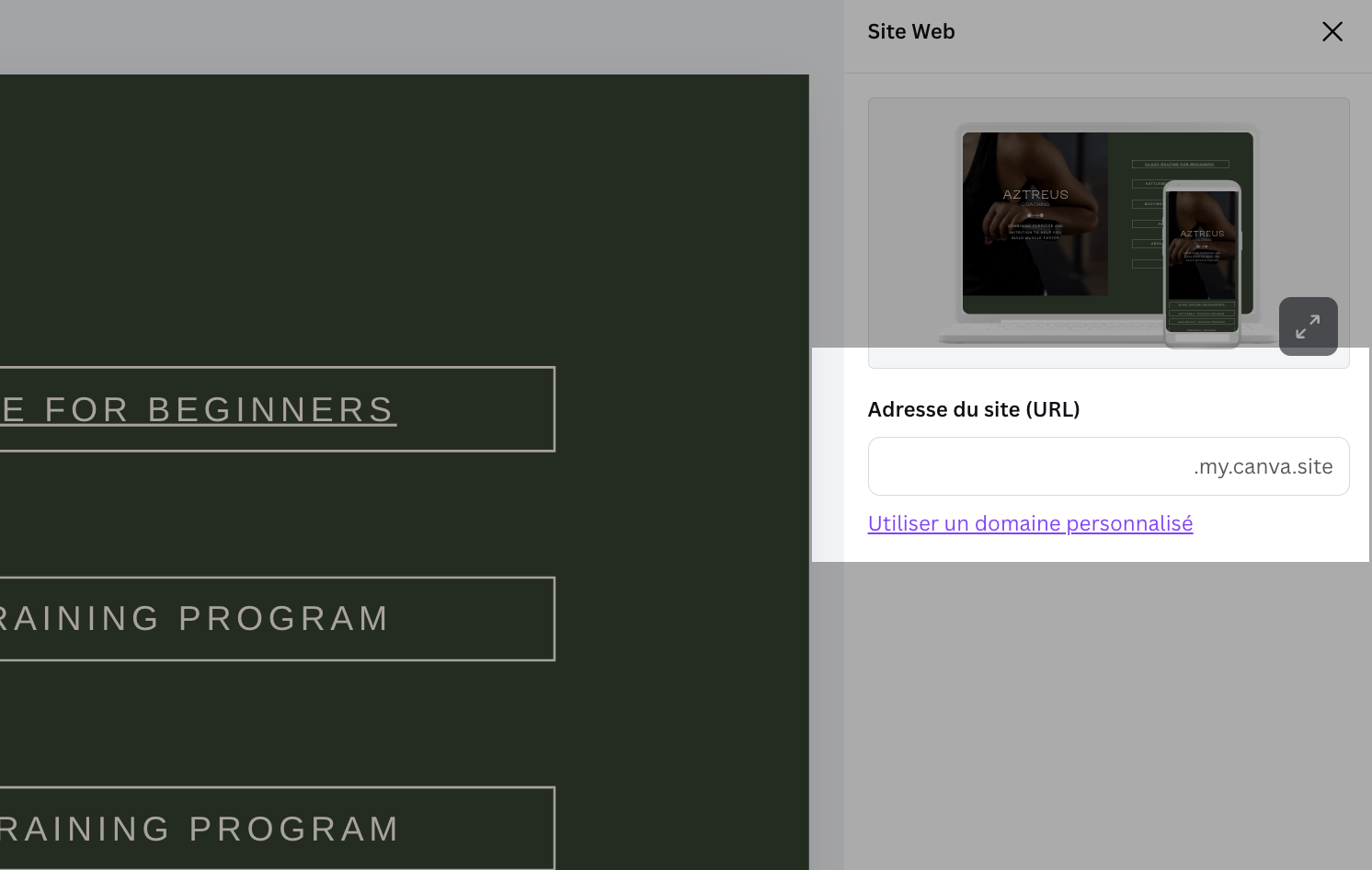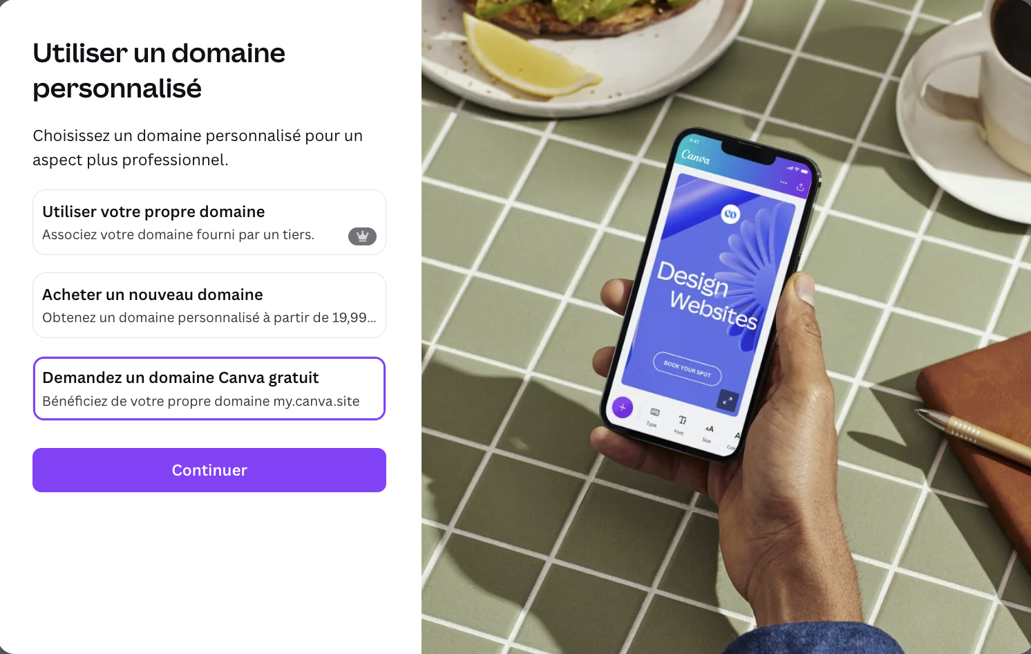 Pour publier votre modèle, cliquez sur le bouton en haut à droite intitulé « Publier comme site web ». Si vous n’avez pas de nom de domaine (et que vous ne souhaitez pas en acheter un), choisissez l’option de domaine gratuit. Cliquez sur « Continuer » et saisissez votre sous-domaine (vous pourrez le modifier ultérieurement). Canva vous demandera d’ajouter un court texte de présentation de votre entreprise et des services que vous proposez. Cliquez ensuite sur « Publier ».